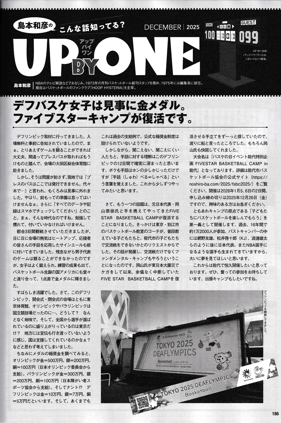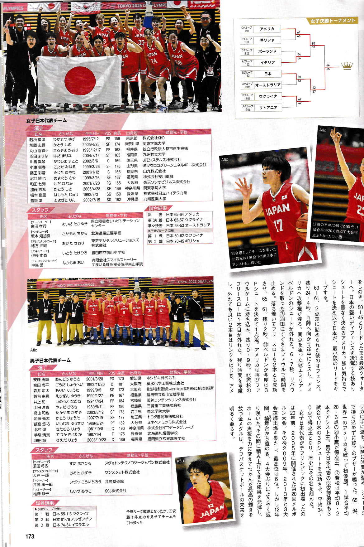 また、島本和彦氏のコラム「UP BY ONE」でもデフリンピック観戦しての感想とともに、今後について触れていただいているほか、巻末のウインターカップ予選特集では、デフリンピック日本代表候補にも選出された松尾芽依選手が、ウィンターカップ出場を決めた瓊浦高校(長崎)のメンバーとして紹介されています。